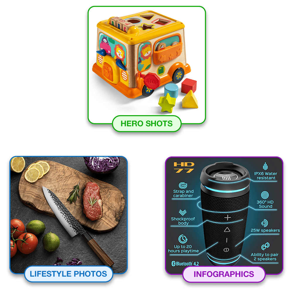 Each of our Amazon Photography packages are made up of Hero Shots, Lifestyle Photos, and Infographics. Click on each to learn more (opens in a new tab).